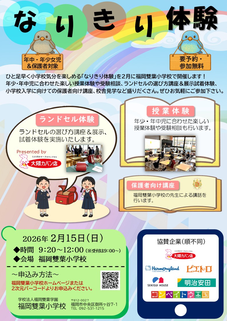 Instagram こどもたちの笑顔とともに、 つむがれてきた福岡雙葉学園の歴史の心。 明日へとまっすぐ手を伸ばす勇気と希望を育んでいます。 福岡雙葉小学校 Movie Gallary 小学校紹介 アフタースクール紹介 校長挨拶 ふたばの魅力 オープンスクール・入試日程 1日の流れ・年間予定 在校生・保護者の皆様へ お知らせ Notice 福岡雙葉小学校公式Instagram 福岡雙葉小学校の日々の様子をInstagramでお伝えします。@fukuokafutaba_elem FB Global Times 福岡雙葉小学校の各種委員会児童が、学校生活やトピックを英語でご紹介します。 福岡雙葉小学校『アフタースクール』 お子さまの『やりたいこと』を新たな形で『できる』に変えていきます。 福岡雙葉小学校英語教育について 英語担当教員たちと関わりながら、「使える英語」を学びます! 入試要項 詳細はこちら 転入試験募集要項 詳細はこちら イベント情報 Event 年中・年少女児対象 小学生なりきり体験 2/15(日)開催します! ★アフタースクール スタート★ 個別相談のご案内 イベント一覧をみる
